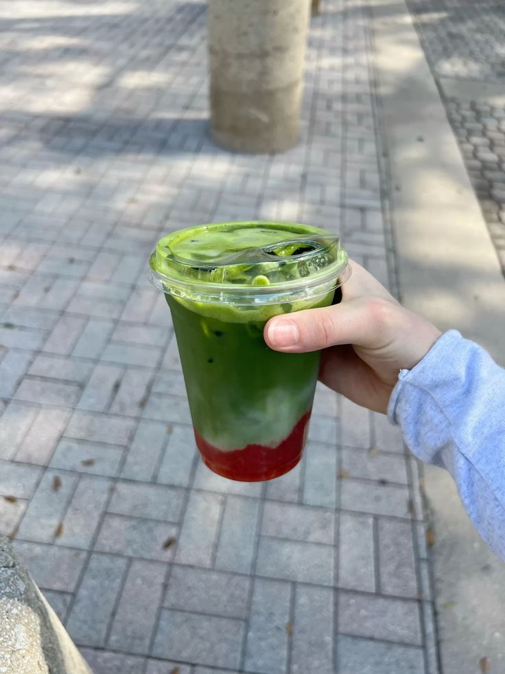 Crea tu shot de matcha como te enseñamos en la receta de un matcha latte. En un vaso, llena el fondo con mermelada de fresa, hielos, luego añade la leche y termina con el matcha.